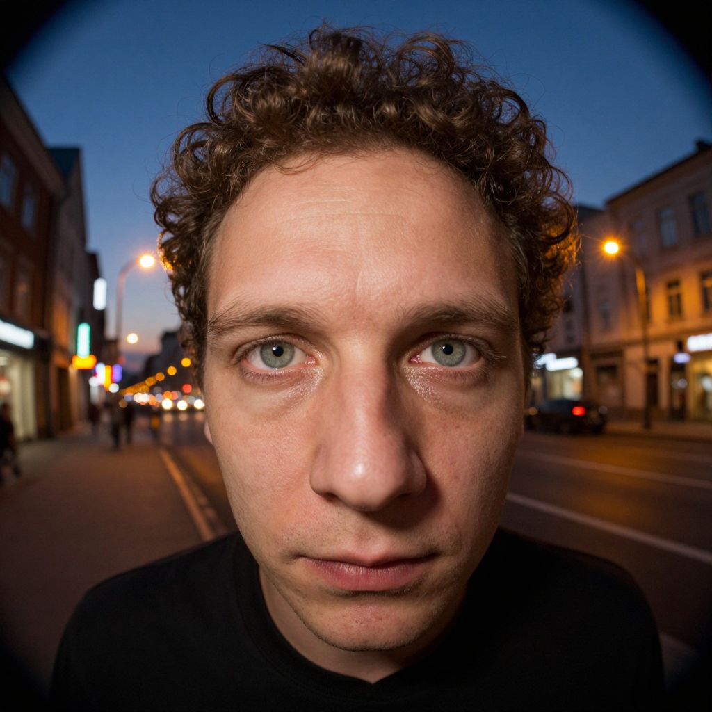 Create a photorealistic portrait of a Slavic man with mesmerizing misty green eyes and short, curly brown hair, captured from an intriguing angle akin to a fisheye lens. Set against a vibrant cityscape at dusk, the warm glow of streetlights and neon signs reflects off his thoughtful expression, marked by subtle lines around his eyes that convey wisdom and experience. The rich color palette contrasts sharply with the deepening twilight sky, creating an emotional gradient from introspection to a sense of belonging within this dynamic urban environment.
