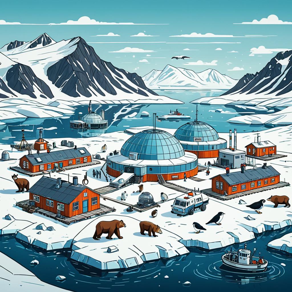 Illustration of an arctic research station, kid-friendly, cool colors, cartoon style, curious animals, educational, detailed landmarks