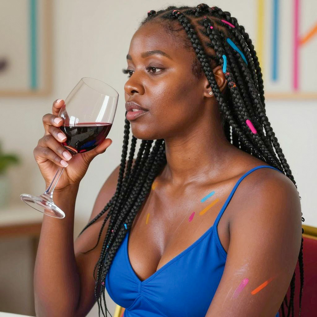 Two Black women in white bathrobes and grey head wraps sit on a wicker couch, facing each other. Both have bare feet, the woman on the left with knees up, the woman on the right with one leg crossed over the other. Mirror in background, minimalist black and white artwork on the left wall, white walls, black marble floor. They look at each other with neutral expressions.