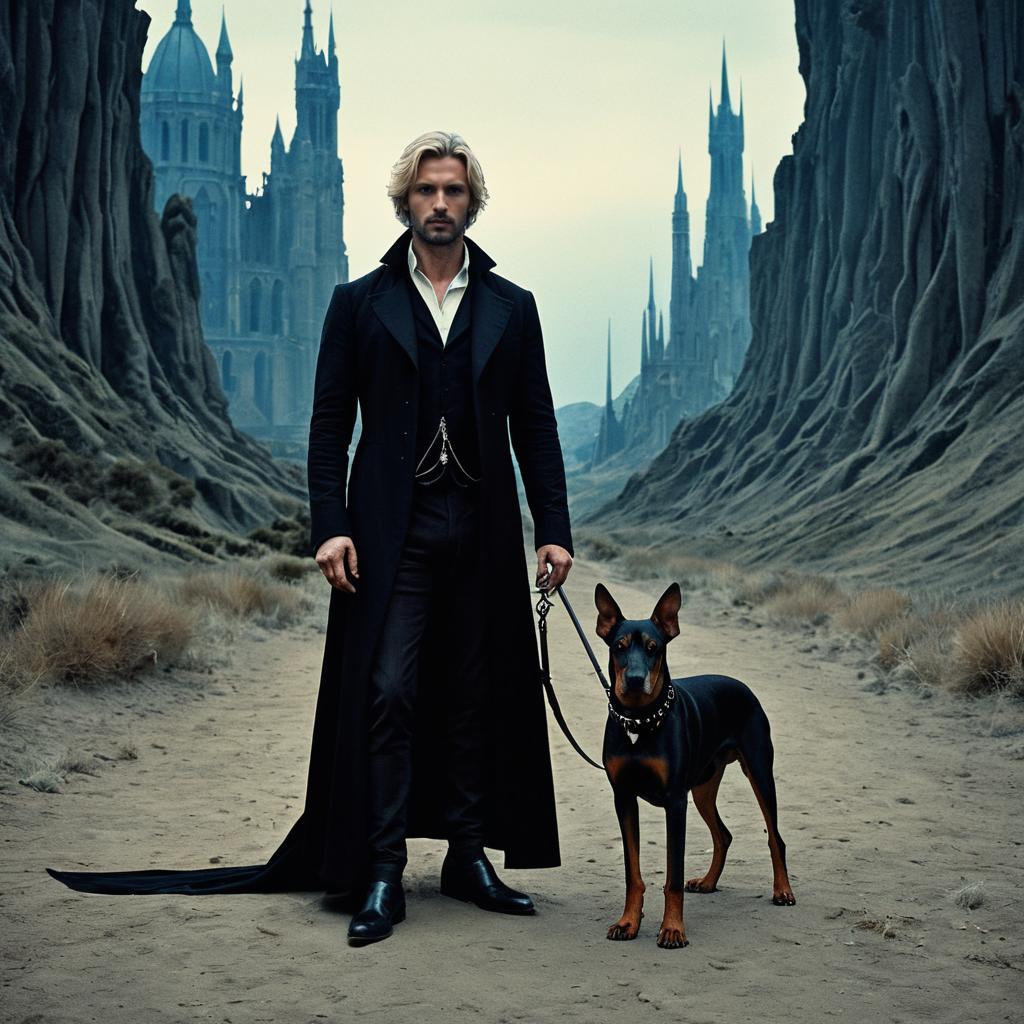 Realistic detailed portrait movie shot of an elegant blond male vampire with a doberman on a leash, sci fi landscape background by denis villeneuve, jean deville, amano, yves tanguy, alphonse mucha, max ernst, caravaggio, roger dean, masterpiece, rich moody colours, blue eyes