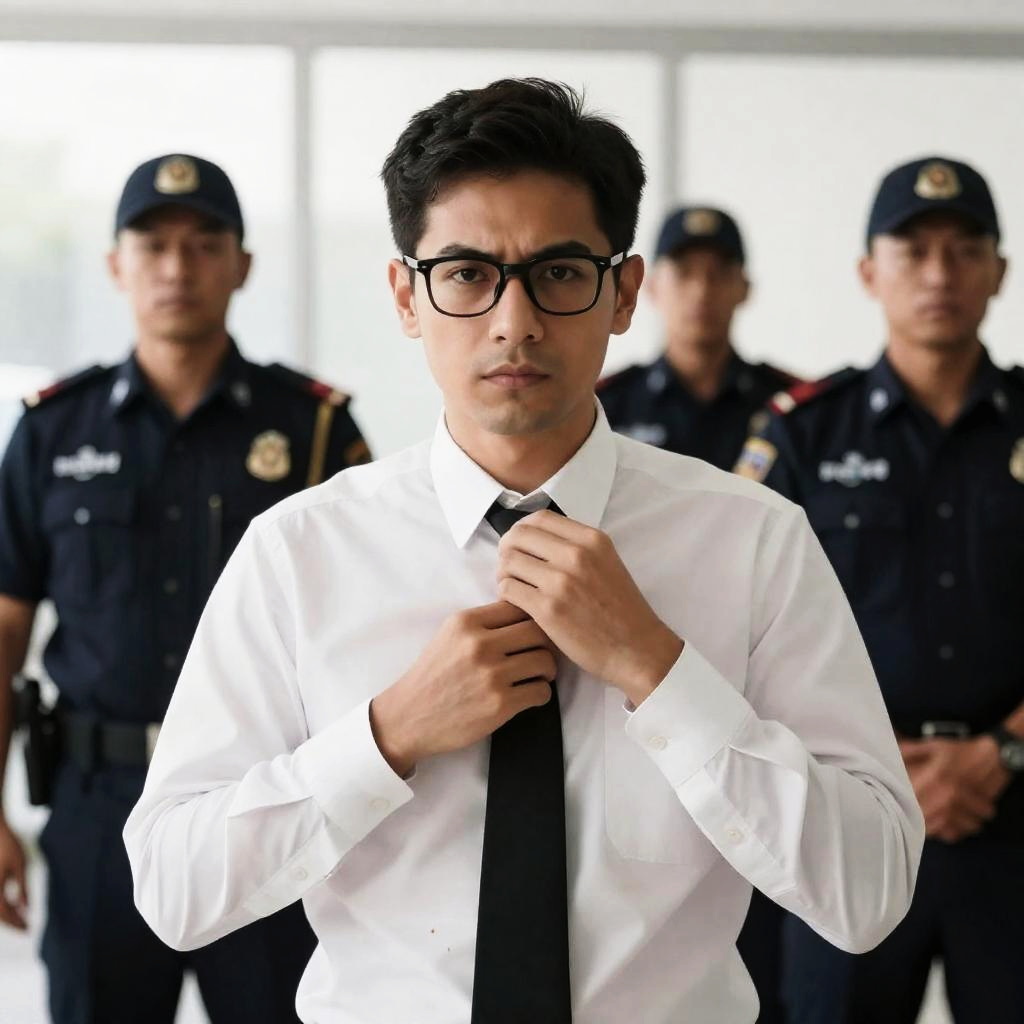 Photograph of a man with short black hair, light skin, and a serious expression, standing in front of a glass door. He is wearing a brown button-up shirt and holding a phone to his right ear with his right hand. Behind him, there is a parking meter attached to the glass door. The background shows a blurry outdoor landscape with blue skies and distant hills.