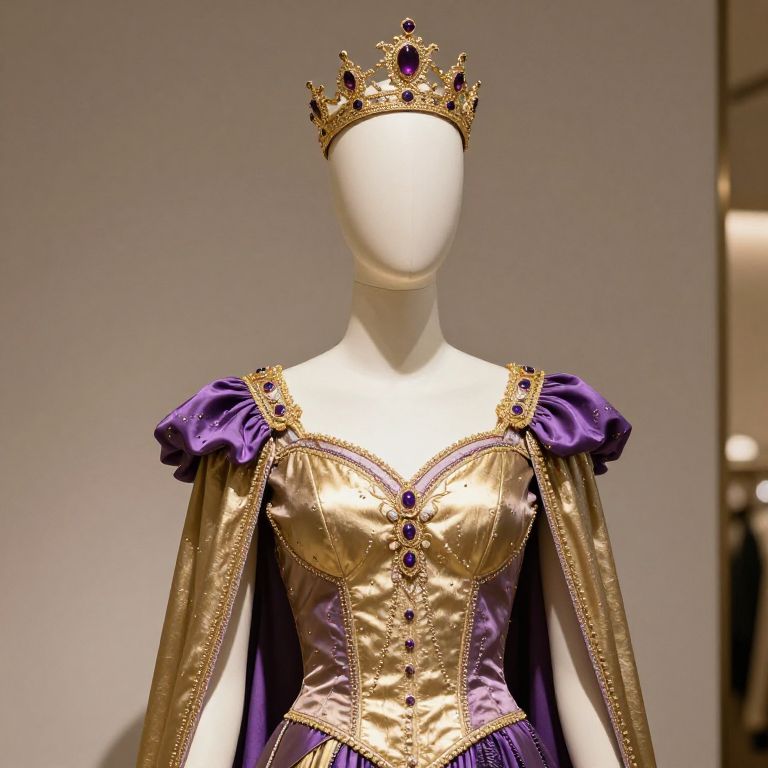 Mannequin wearing a gold and purple outfit with a crown on his head.