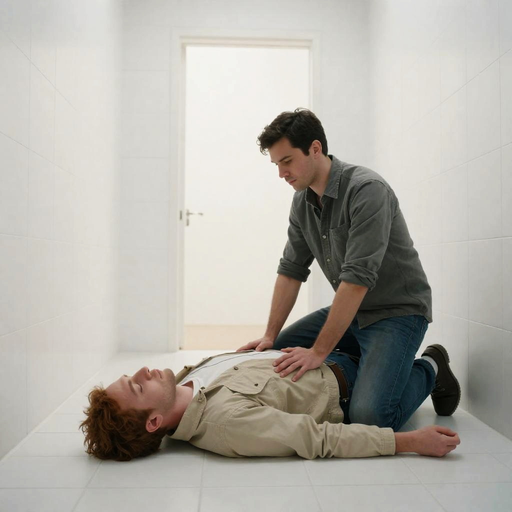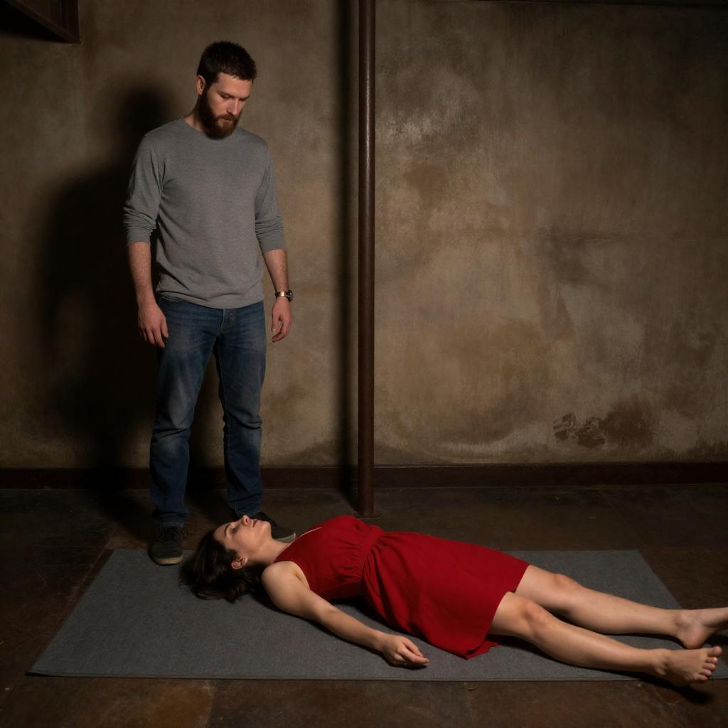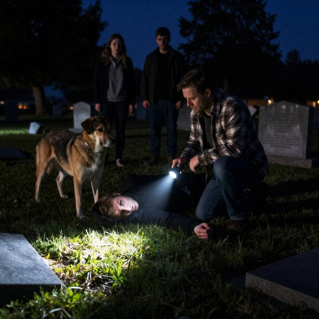 Photograph of a nighttime scene. Man with short dark hair, sleeveless black shirt, and light pants kneels beside a woman with blonde hair and a red and black patterned shirt. She is lying on pebbles, partially reclined. Man's hands are on her chest. Various items, including a blue bag and clothes, scattered around them. Background is a dark, ured surface. Man's expression is focused. Woman's face is not visible.