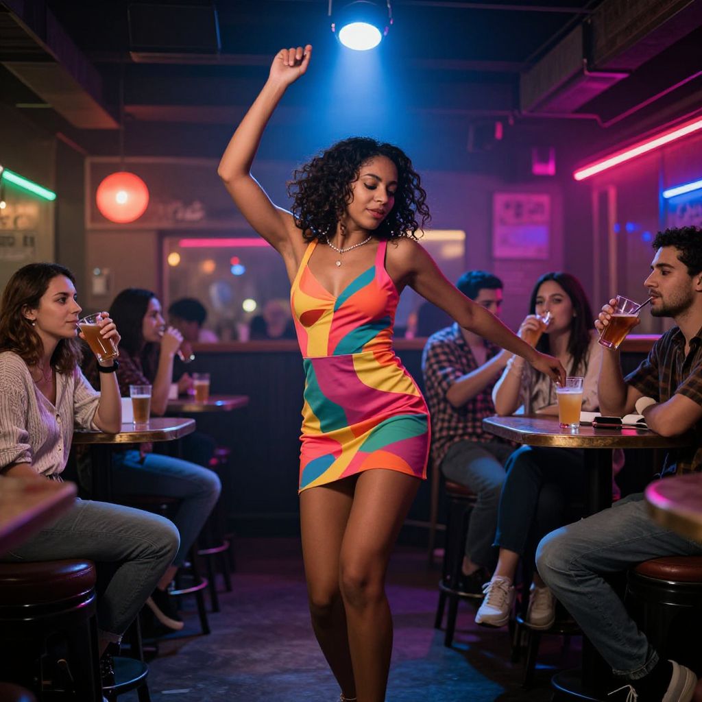 A woman in a vibrant dress dances under a spotlight in a neon-lit tavern bar, surrounded by people enjoying drinks and the lively atmosphere.