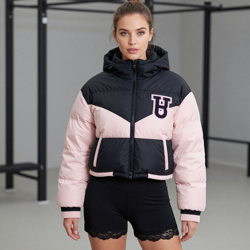 Photograph of a young woman with fair skin and brown hair in a high ponytail, wearing a black and pink puffer jacket with a hood and a large "U" logo on the right chest. She pairs the jacket with black lace-trimmed shorts. The background is a minimalist, industrial-style room with gray walls and black metal frames. The lighting is bright, highlighting the textures of the jacket and the lace on the shorts. The overall style is modern and casual.