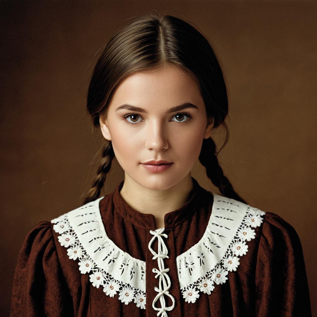 Victorian childrens dressing ,solo, 1girl, realistic, dress, long sleeves, looking at viewer, brown hair, closed mouth, standing, frills, bonnet, painting (object), long hair, twin braids, braid