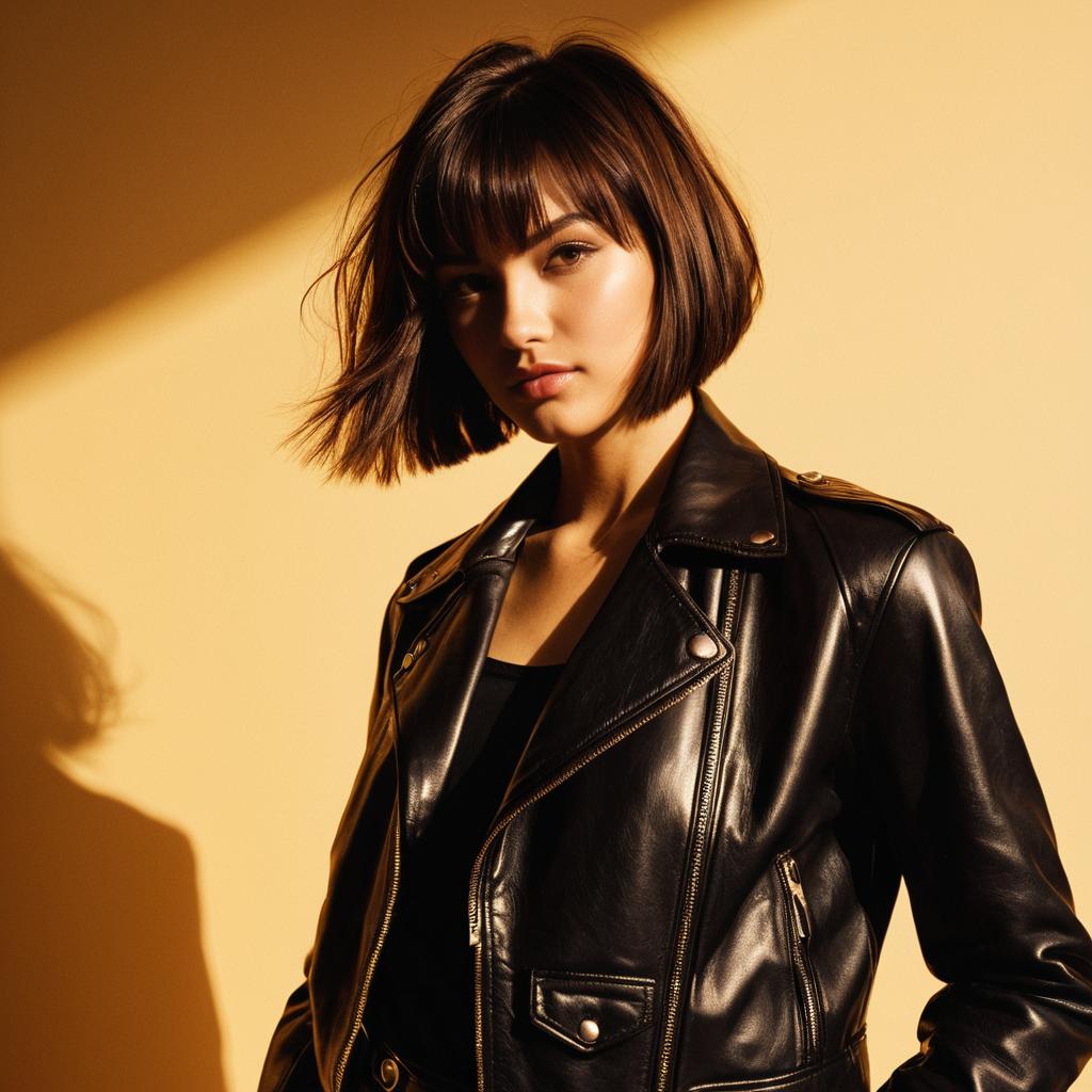 Stacked Bob hairstyle on young girl, wearing asymmetrical dress, in rooftop terrace, captured in fashion editorial style with cool tone lighting.
