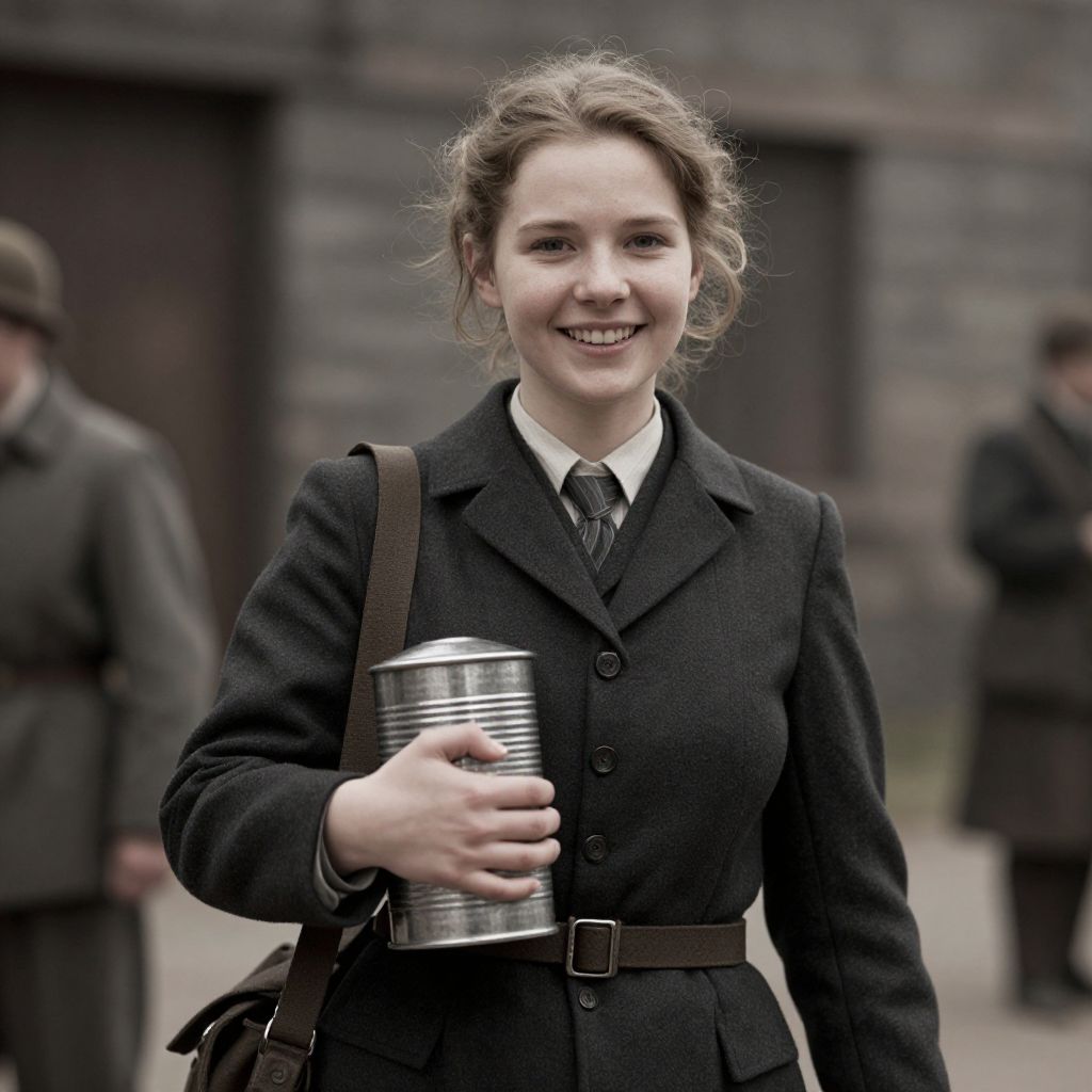 Photograph of a smiling young woman with fair skin and light brown hair in a loose updo, wearing a dark, buttoned wool coat with a white shirt and striped tie. She holds a silver metal can in her right hand and carries a brown leather strap over her left shoulder. The background features blurred figures dressed in similar dark, old-fashioned clothing, and a stone building with dark brown doors. The overall color palette is muted, with dark browns and grays dominating the scene, suggesting a historical or wartime setting.