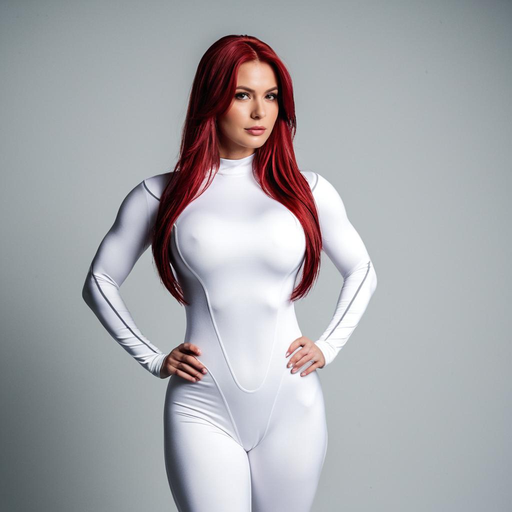 Realistic portrait of a woman wearing a tight white muscle bodysuit, standing with hands on hips. The subject has long, vibrant red hair and a confident expression, looking directly at the viewer. The smooth, form-fitting costume highlights muscular contours and feminine features against a neutral gray background.