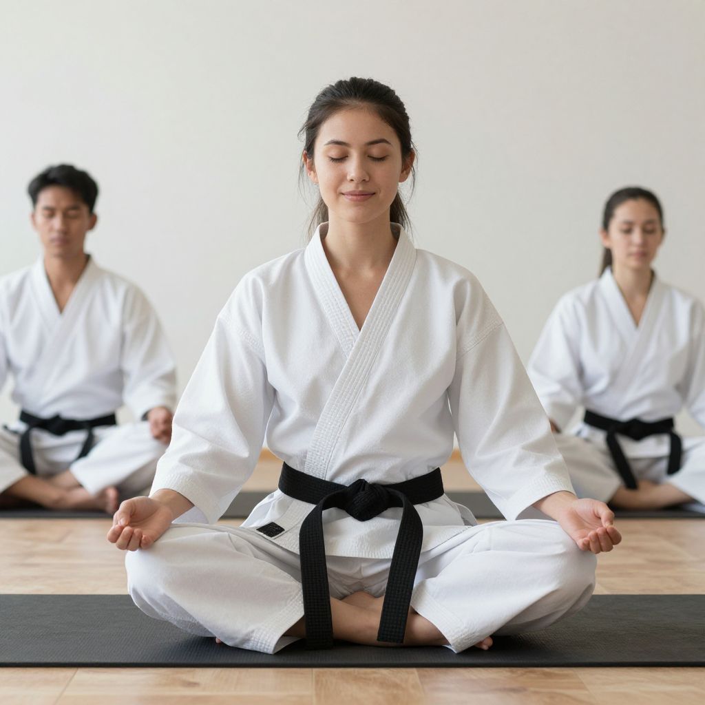 Photograph of a young woman with light skin and dark brown hair in a white karate gi with a black belt, sitting cross-legged on a black mat in a meditation pose. She has her eyes closed and a calm expression. In the blurred background, three other women, also in white karate gis with black belts, are similarly seated in meditation. The setting is a bright, white-walled room with a wooden floor, suggesting a dojo or training space. The image emphasizes focus, calmness, and discipline.