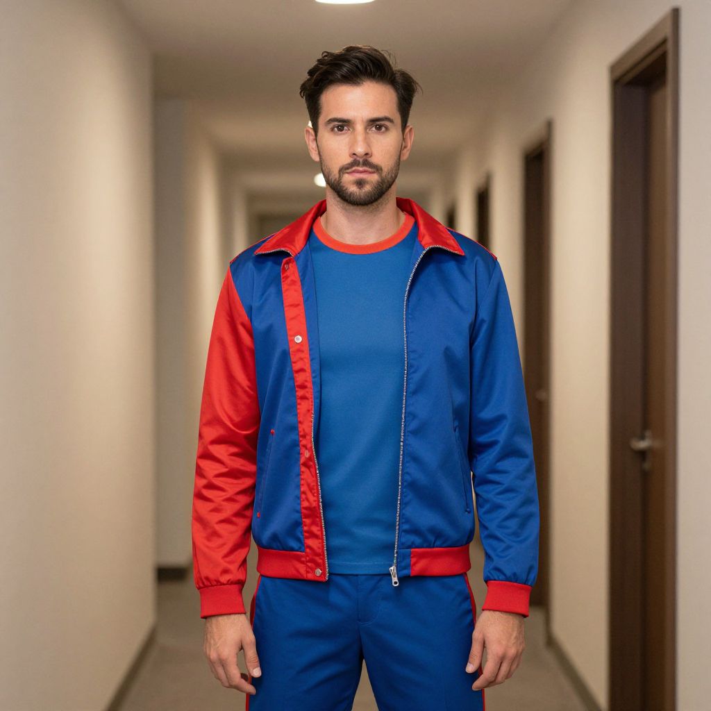 Rainbow Costume Blue, man in a blue and red jacket standing in a hallway