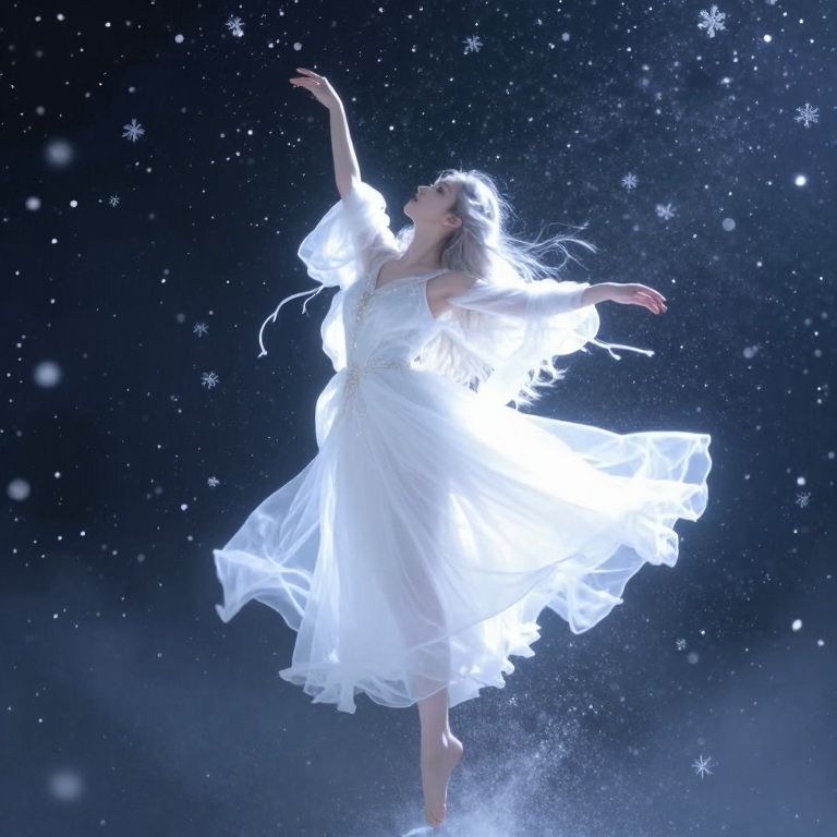 Photograph of a glowing, ethereal woman in a flowing white dress, dancing against a starry, snowy night sky. Her arms are raised,