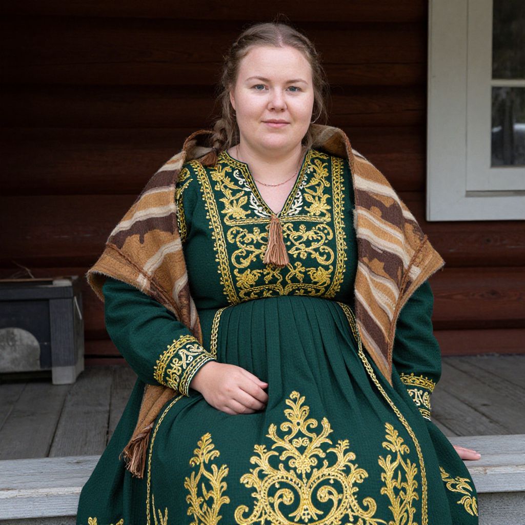 A high-resolution, natural lighting photograph of a Norwegian woman in a richly embroidered bunad folk dress, the dress is deep green and gold with layered embroidery depicting traditional Norse designs, she is seated on a wooden bench in a historic cottage in the Norwegian countryside, her face shows a calm, wise expression with a round face and a strong nose, wearing a wooden shawl over her shoulders. The woman has big tits and cute face