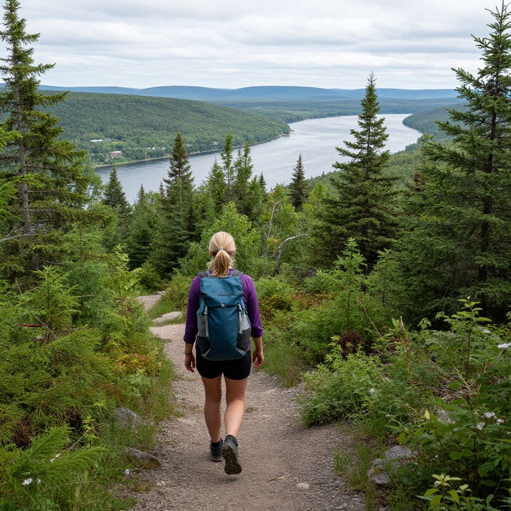 Hiker exploring the verdant trails of Le Sentier des Caps in Quebec, Canada, with a breathtaking view of the St. Lawrence River and lush forests stretching into the horizon. #hiking #camping #solo #Quebec #Canada #trekking #backpacking #femalehikers #awomanafoot.com