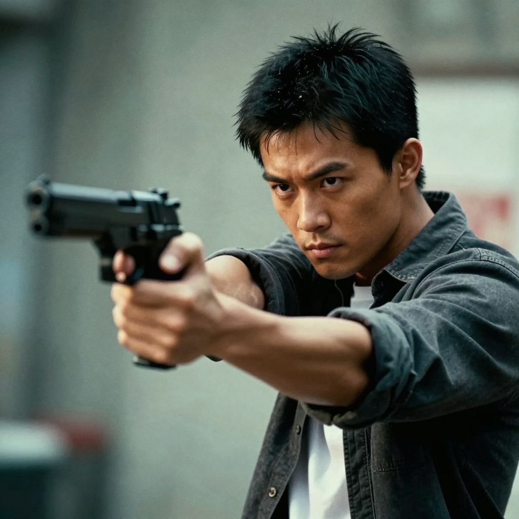 Solo, shirt, black hair, 1boy, holding, weapon, male focus, holding weapon, gun, holding gun, handgun, realistic, Asian, cinematic, action-themed, violence, aim, aiming, pointing, Kodak, Film style, movie style, film grain, film contrast, action packed, serious, stunt, Hong Kong action cinema style, shallow depth of field, vignette, highly detailed, high budget, bokeh, cinemascope, moody, epic, gorgeous, grainy