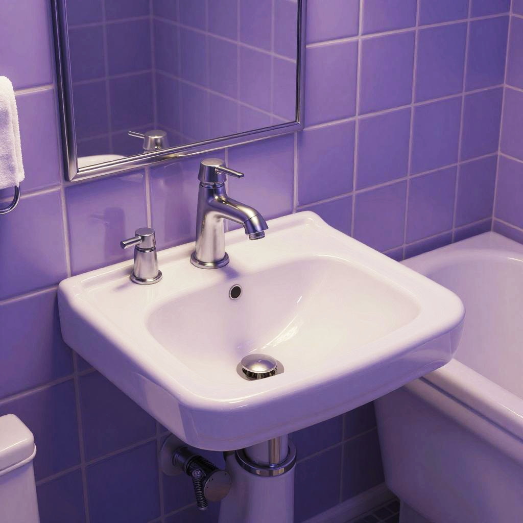 Best quality, ultra-detailed, illustration, LHbathroom, sink, bathtub, bathroom, indoors, tile wall, tiles, bath, faucet, realistic, purple theme