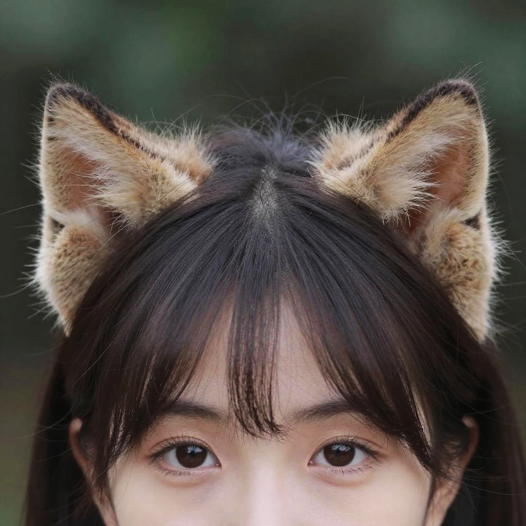Photograph of a young East Asian woman with straight, dark brown hair and large, dark brown eyes, wearing realistic, fuzzy, brown and black cat ears with white fur tips. The cat ears are positioned on top of her head, slightly tilting to the sides. The background is blurred with dark green and black hues, suggesting an outdoor forest setting. Her face is partially visible, with the focus on her expressive eyes and the cat ears. The image has a whimsical, fantasy-like quality, blending human and animal features.