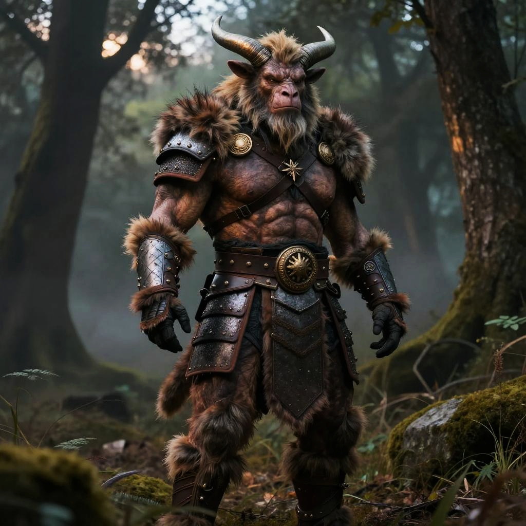 Realistic minotaur costume designed with lifelike skin textures, rugged fur, and authentic armor pieces, posed in a misty forest clearing at dusk, dramatic shadows and highlights, hyper-detailed, fantasy art style, immersive atmosphere.