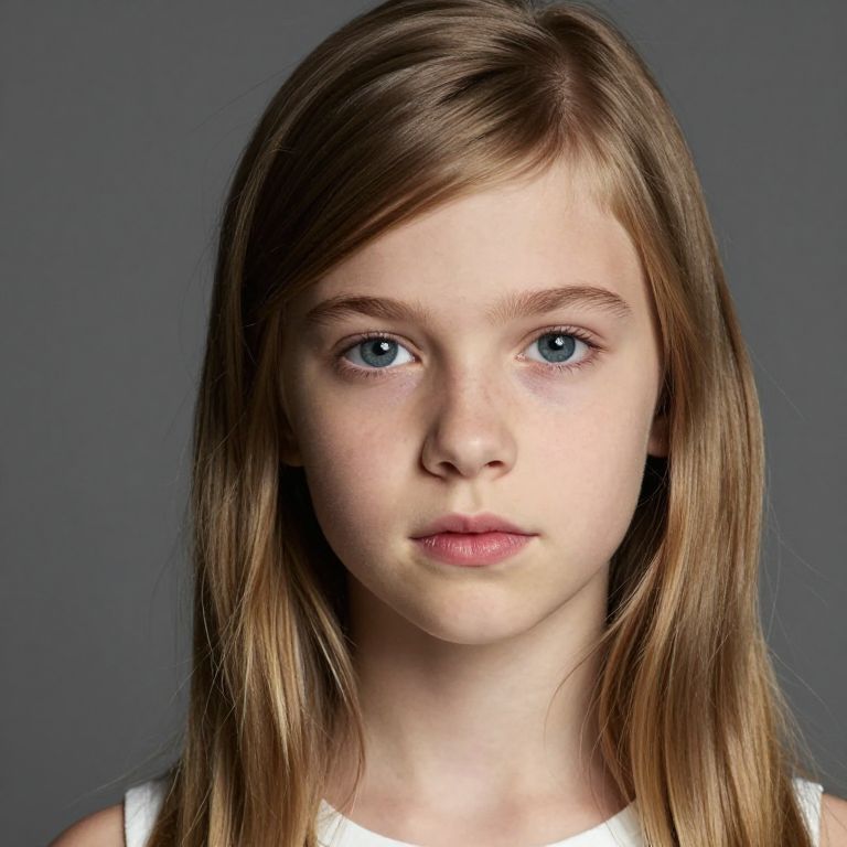 Cd A 15 year old dark dirty blond blue dark eyes long hair side bangs white dark eye brows thin pink lips.small nose,