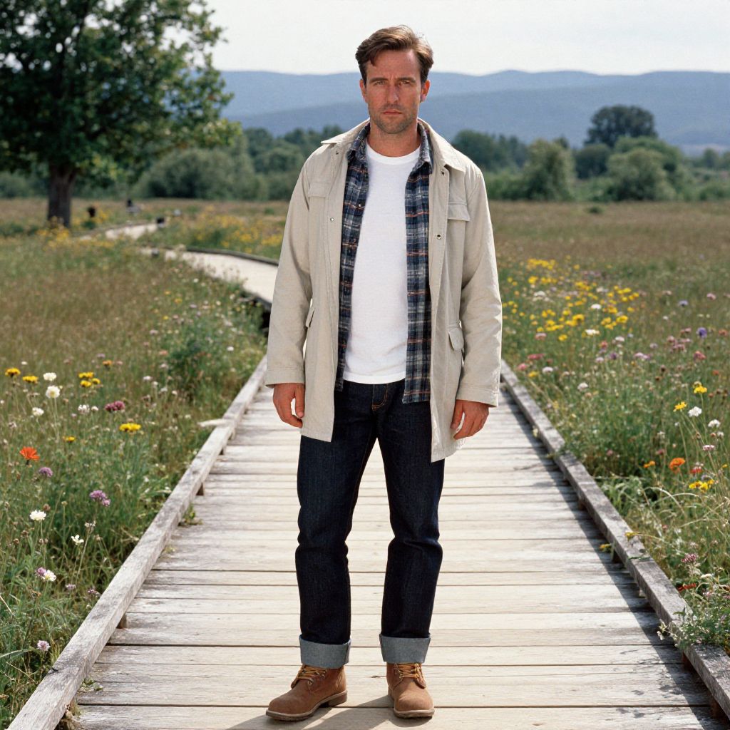 A man, classic white crew-neck t-shirt, dark denim jeans, versatile desert boots, lightweight anorak, soft flannel overshirt, rustic wooden boardwalks winding through, vibrant wildflowers blooming, distant mountains framing the horizon, eastman film stock, relaxed expression, warm sunlight filtering through trees. Man has masculine face and piercing eyes