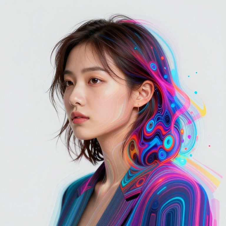 This is a digital artwork featuring a young Asian woman with fair skin and short, slightly messy black hair. She has a neutral expression and is looking slightly to the left. Her hair is adorned with vibrant, swirling, multicolored patterns in blue, pink, and orange, which extend onto her shoulders. She wears a dark blue, collared shirt. The background is pure white, making the colorful patterns stand out. The artwork has a hyper-realistic style with a touch of surrealism due to the abstract, glowing patterns. The image is highly detailed, emphasizing the textures of her skin and hair.