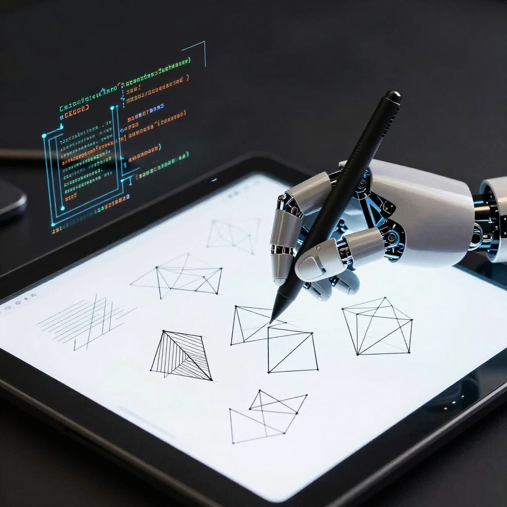 Line art AI generator visual, a robotic hand drawing precise geometric shapes and abstract line art on a digital tablet, surrounded by floating code and AI algorithms, modern technology meets artistic creativity, sleek monochrome tones