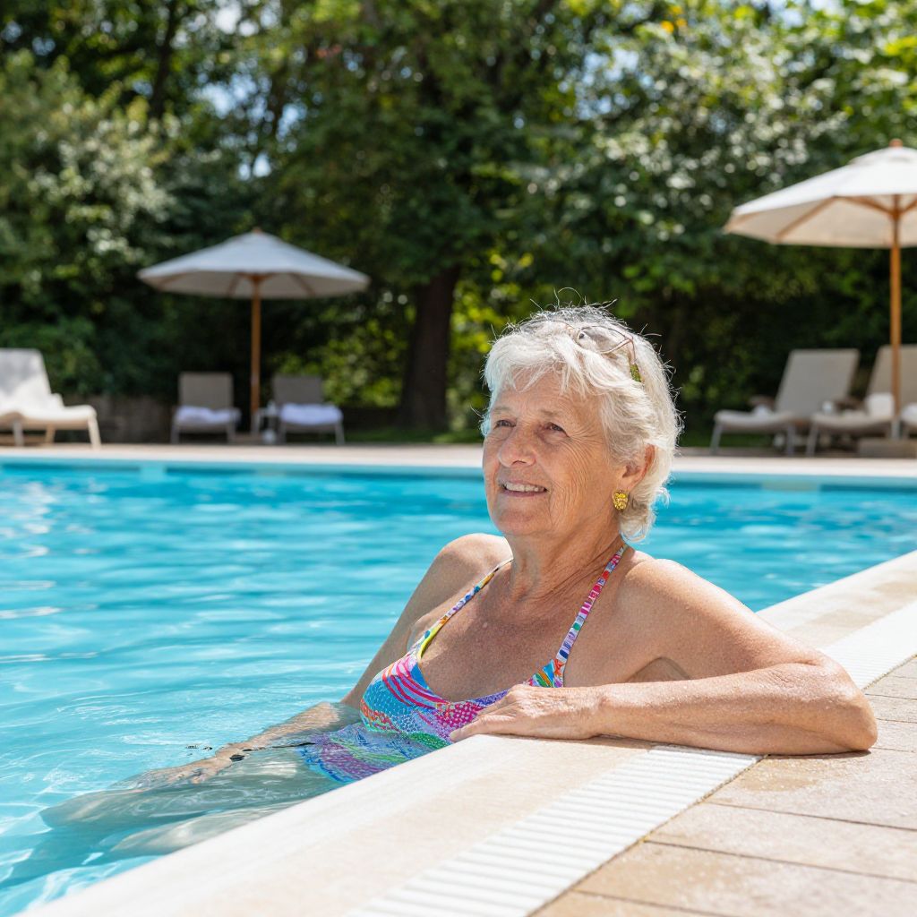 Senior woman enjoying a sunny day in a tranquil outdoor pool, surrounded by lush green trees and lounge chairs in Germany.