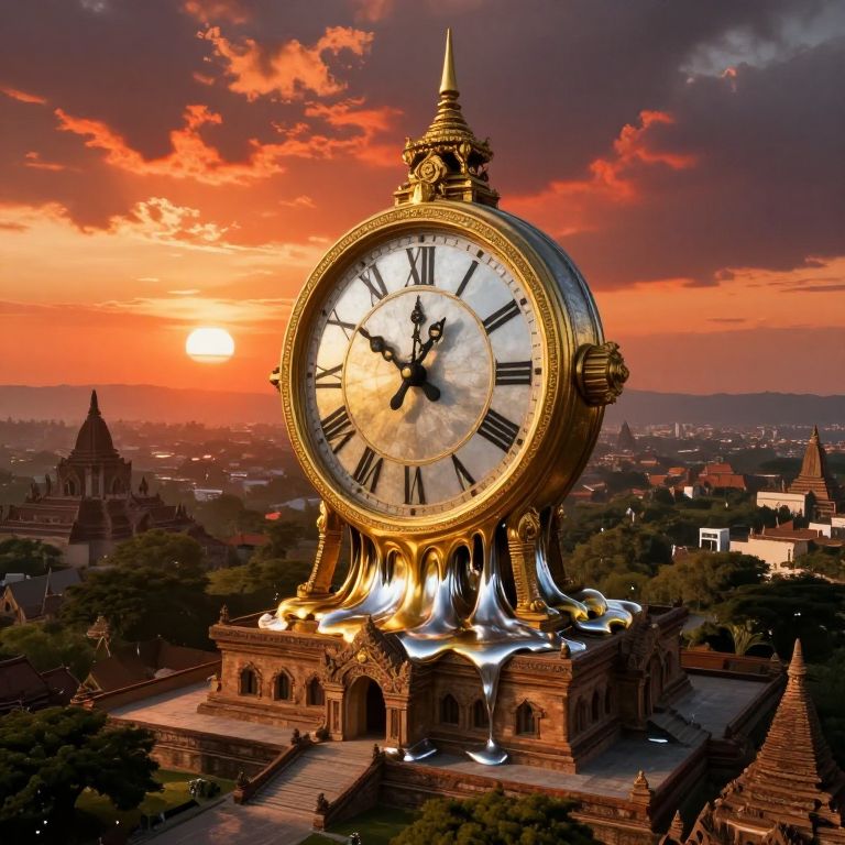 Imagine an expansive dreamscape where a gargantuan clock, its form melting into rivulets of gold and silver, dominates the skyline above an ancient temple. This scene is reminiscent of surrealist works, capturing a fantastical fusion of time periods and elements in a single, dramatic tableau. From a high vantage point, observe how the setting sun paints the sky with fiery hues that contrast dramatically against the molten clock's metallic sheen, casting elongated shadows across the temple's intricate stonework. This panoramic view invites contemplation on the passage of time through the lens of surrealism, evoking both awe at its grandeur and wonder at the imaginative blend of elements it portrays.