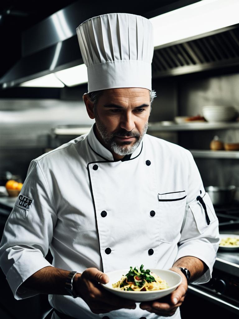 Man in Chef Costume, cinematic realism, stylish culinary portrait
