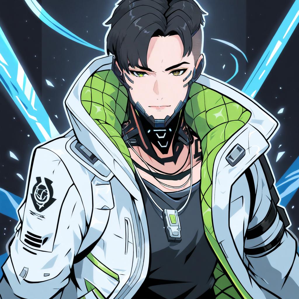 Crypto (apex legends), apex legends, 1boy, black eyes, black hair, parted hair, white jacket, black shirt, black gloves, necklace, undercut, by artist moral cacoethes, animagine