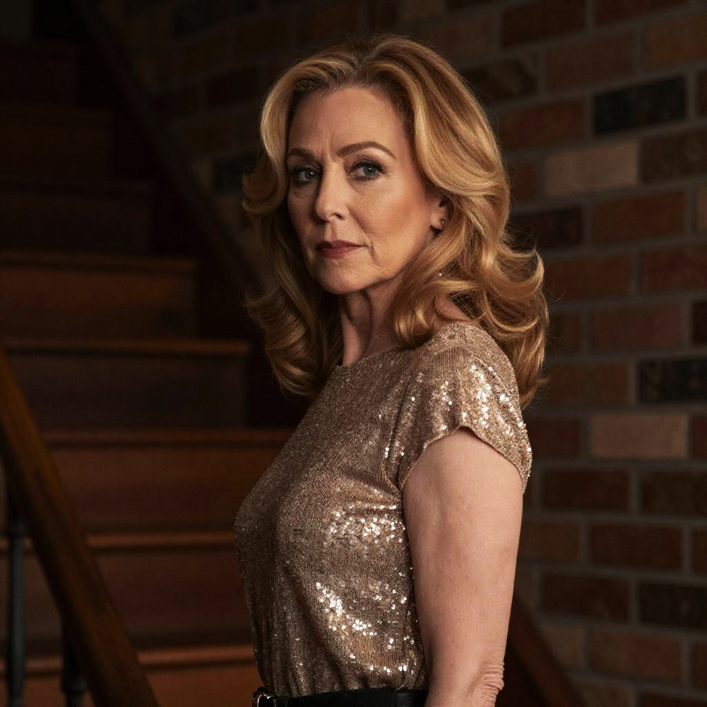 Photograph of a middle-aged woman with curly blonde hair, wearing a fur-lined coat, standing outdoors. She has a slight smile and soft expression. Background includes a gray concrete wall and a blurred building with windows. There's a partial view of a white car in the background. Natural light.