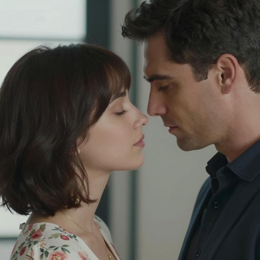 A young woman with long black hair, light skin, and dark eyes smiles softly at a young man with dark brown hair, light skin, and a nose piercing. Both are wearing dark clothing, with the man in a gray shirt. They are facing each other in a dimly lit indoor setting, with two blurred figures standing in the background.