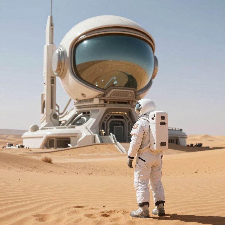 A futuristic astronaut stands in a desert landscape, gazing at a giant, detailed, sci-fi structure with a reflective visor.