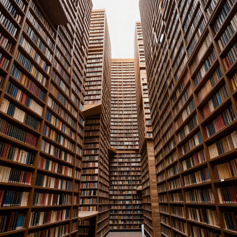 Photograph of a towering, modern library interior with four tall, narrow bookshelves made of dark wood and metal, arranged in a square formation. The shelves are densely packed with books of various sizes and colors, including red, blue, and brown spines. The bookshelves have a sleek, geometric design with horizontal metal slats. The background features a bright, white sky visible through the narrow gap between the shelves. The overall atmosphere is one of organized, modern architecture with a focus on literature. The image has a slightly dramatic, high-contrast lighting effect.