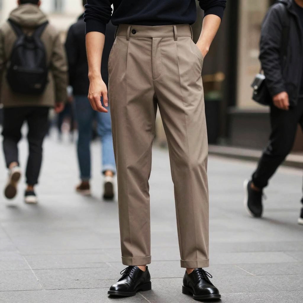 Close-up of a man wearing tailored, high-waisted taupe trousers paired with black leather dress shoes in a busy city street. The trousers are neatly pressed with cuffs, and the outfit reflects modern street style fashion with a muted color palette. Soft natural lighting highlights the texture of the fabric.