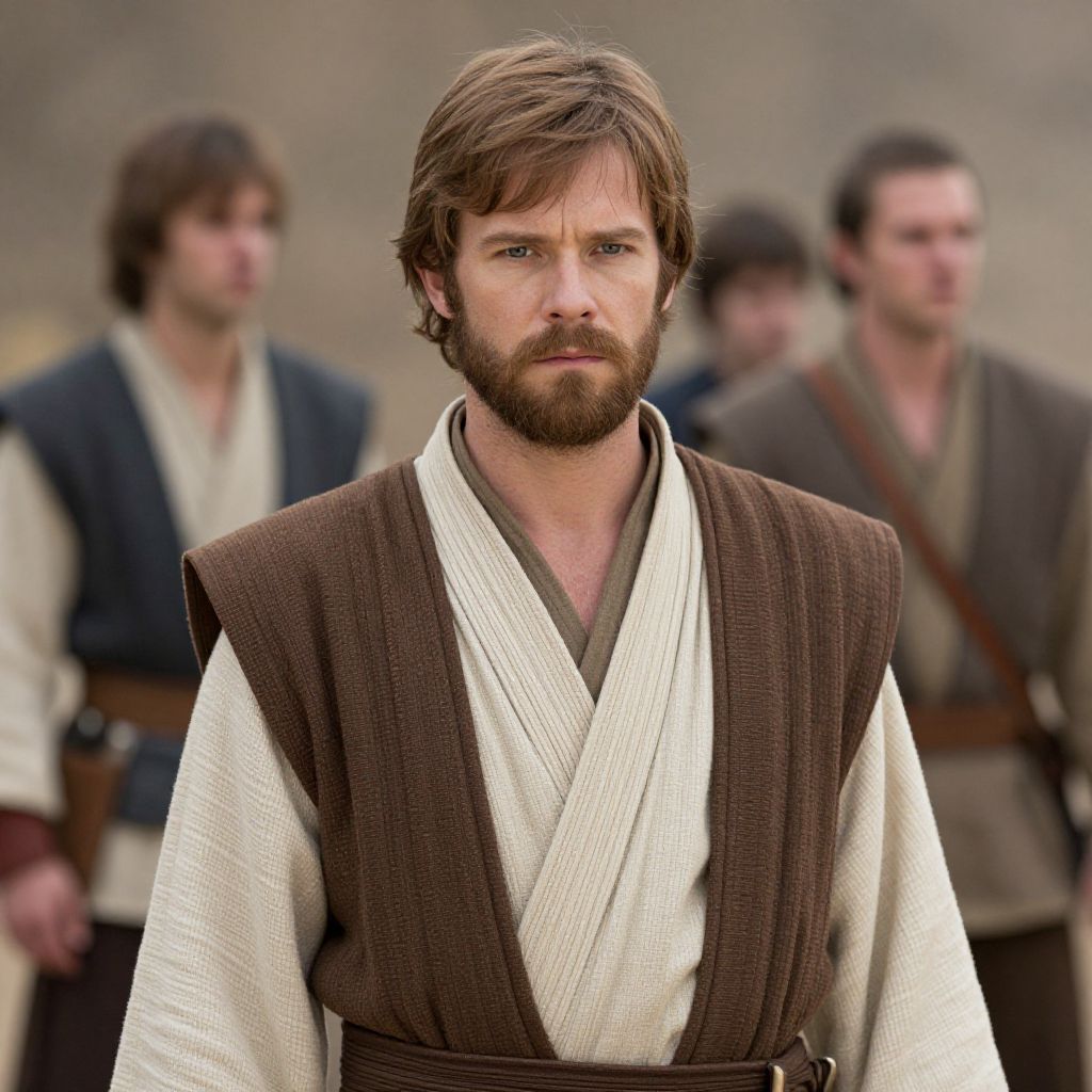 Man with blonde hair and a beard wearing a medieval costume with a brown jacket and a white scarf.