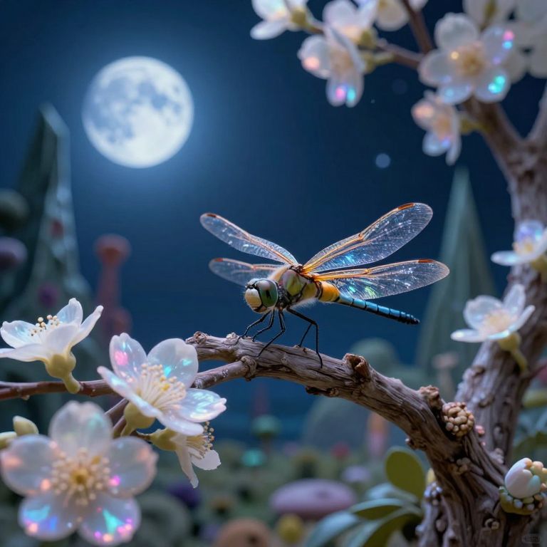 Envision a surreal landscape viewed through a dragonfly's perspective, where an ethereal tree branch adorned with iridescent flowers serves as the stage. The dragonfly rests gracefully on this fantastical branch, its glistening wings reflecting the gentle distortions of light cast by the pulsating blooms. In the background, a celestial blue moon illuminates the angular shapes of the peculiar vegetation, creating an atmosphere that is both captivating and enigmatic. This scene blends wonder with unease, as if witnessing a realm where nature and dreams intertwine in a mesmerizing dance of form and color.
