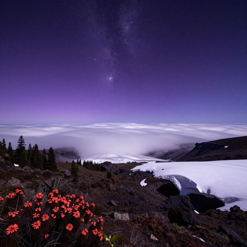 Big island, a mesmerizing scenery of clouds and stars showing a natural landscape, celestial objects in a beautiful sky, taiga, flowers, caves, nature, glacier, woodland, snow, dusk, the most beautiful image in the world, <8k, high detail, uhd, sharp focus, palette, photorealistic, absurdres, extreme detail, as much detail as possible>, matte violet, dark white, dark coral, dark azure