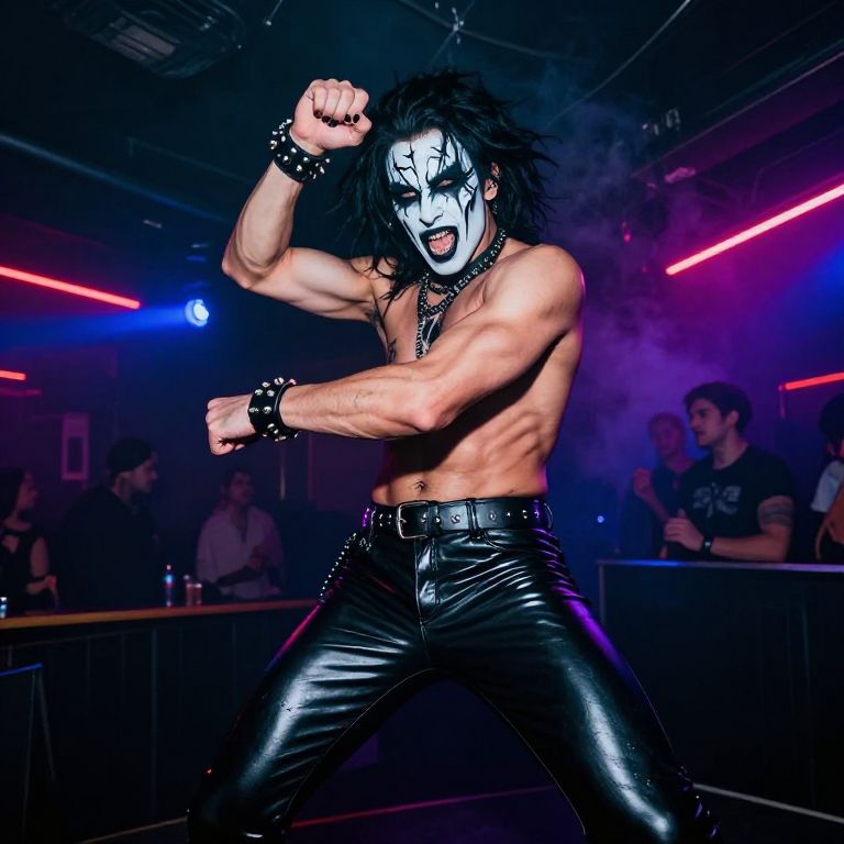 Muscular goth performing in a dimly lit underground club, neon lights reflecting off leather pants and studded wristbands, heavy smoky environment, dynamic pose exuding power and rebellion, detailed face paint and black nail polish.
