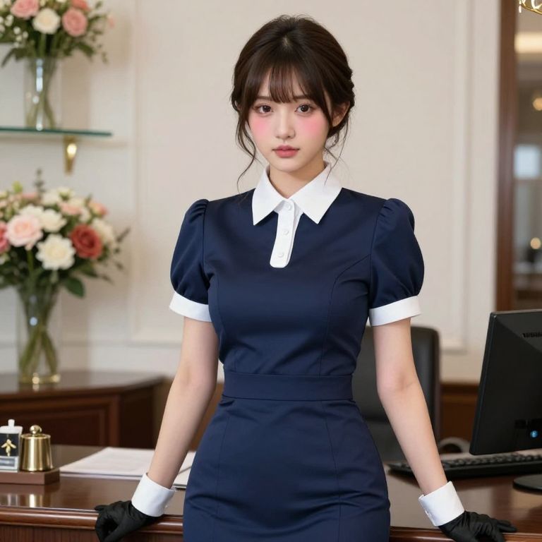 A detailed, high-resolution photograph of a smart, stylish maid in a high-quality maid outfit — a tailored navy blue dress with a white collared shirt, black gloves, and a neat hairstyle with loose bangs. She has a delicate face with soft pink cheeks and a calm expression, posing confidently in a luxurious office-style room with floral decorations and glass shelves.