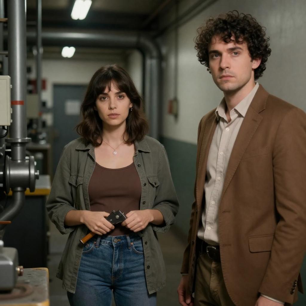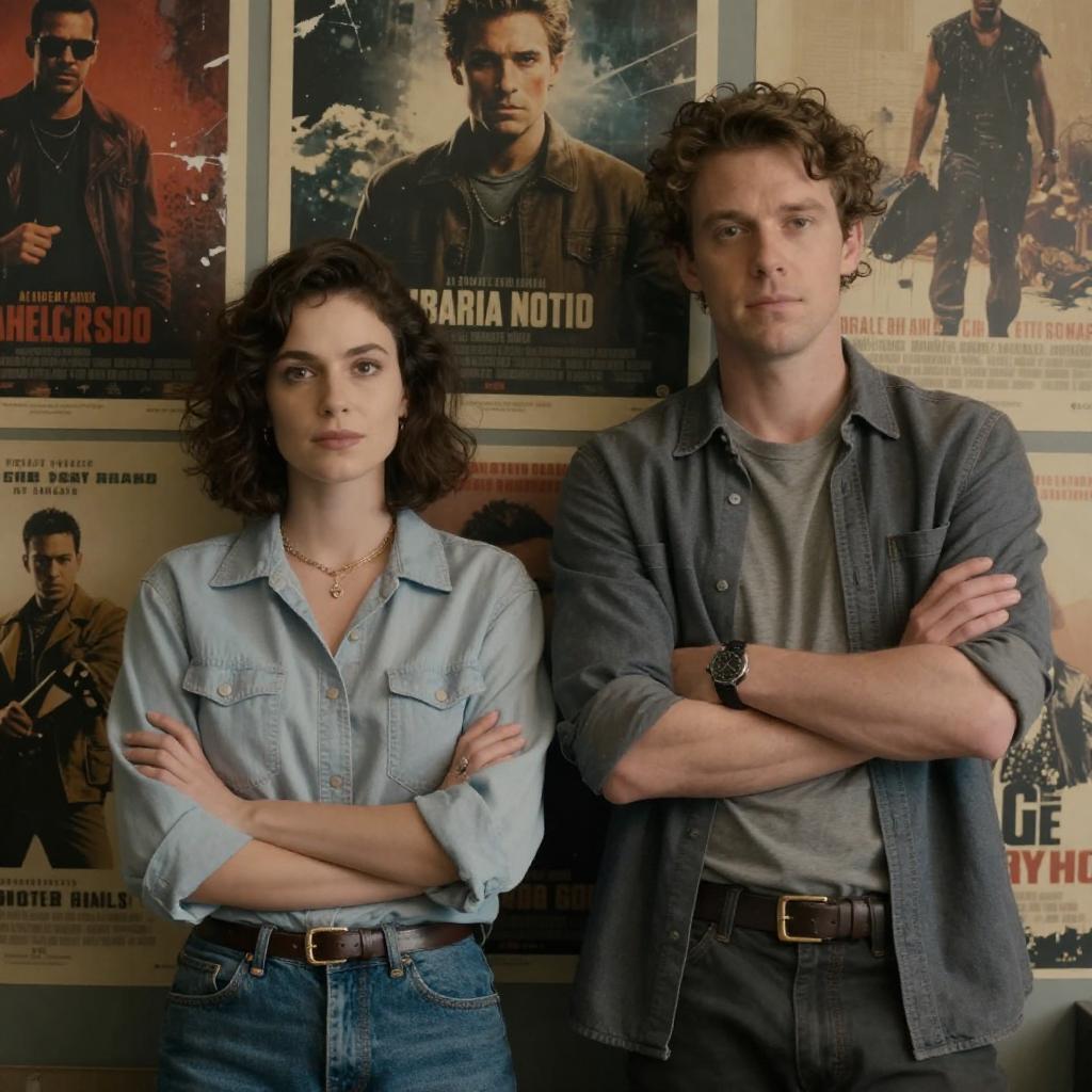 A thoughtfully composed movie scene featuring a man and woman standing confidently against a backdrop adorned with gritty, artistic movie posters, capturing the essence of a dramatic narrative.