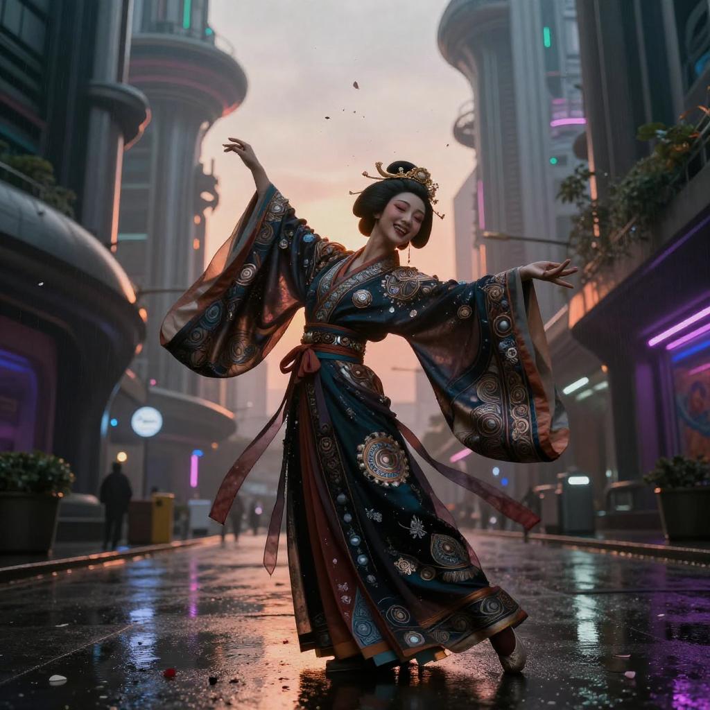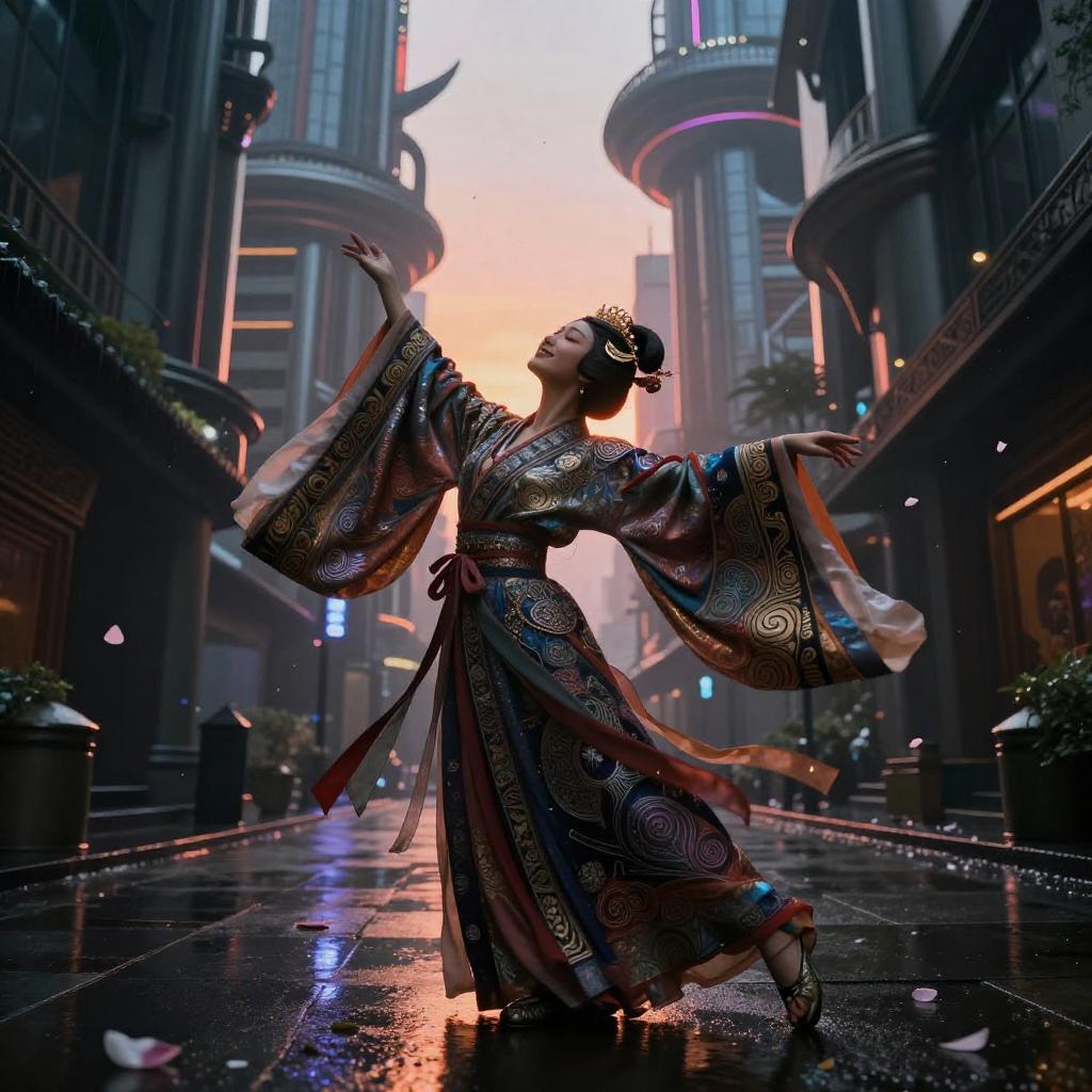 Best quality, masterpiece, ultra high res, raw photo, beautiful and aesthetic, deep shadow, dark theme, (photorealistic:1.4), masked dancer (Noh-inspired), wearing intricate flowing Hanfu with metallic embroidery and silk ribbons, soft smile, open mouth, closed eyes, ((chiaroscuro, backlight, sunset, petals floating)), graceful poise, evocative atmosphere, magnetic presence, captivating mystique, intricate zentangle patterns, astonishing level of detail, striking perspective, a chaotic masterpiece balanced by harmony, vibrant color palette, ((outdoors)), rain-soaked alley with neon haze and reflective puddles, towering futurist architecture, inspired by futurist architecture