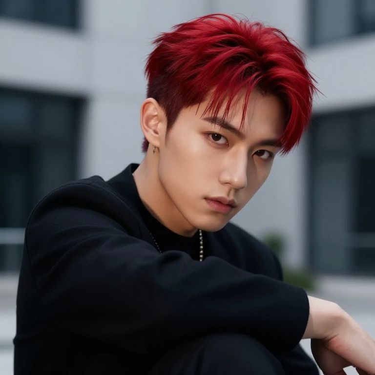 Red highlights male portrait, soft lighting illuminating his confident expression, modern urban background, stylish haircut with vivid red strands, subtle shadows, high detail, dynamic pose, trendy fashion, photorealistic style.