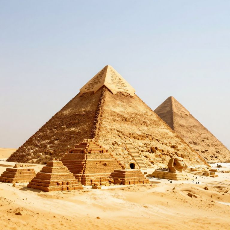 Photograph of two large, ancient Egyptian pyramids under a clear, bright blue sky. The pyramids are made of weathered, beige limestone blocks, with the larger pyramid in the foreground and a slightly smaller one in the background. In front of the pyramids, there are several smaller, stepped pyramids made of the same material. The desert sand around them is light beige, and the sunlight casts sharp shadows, highlighting the textures of the stone. The overall scene evokes a sense of ancient history and grandeur in a vast, arid landscape.