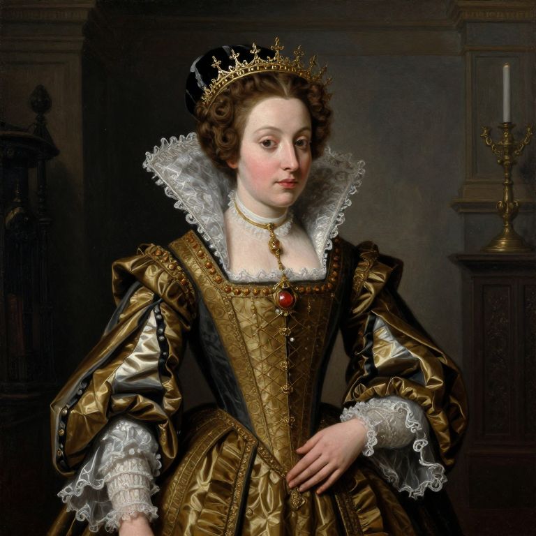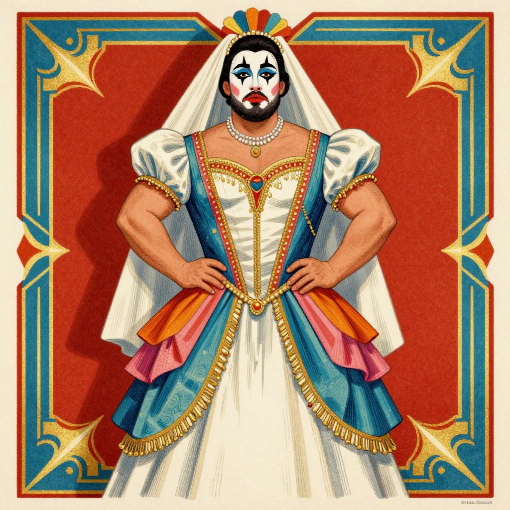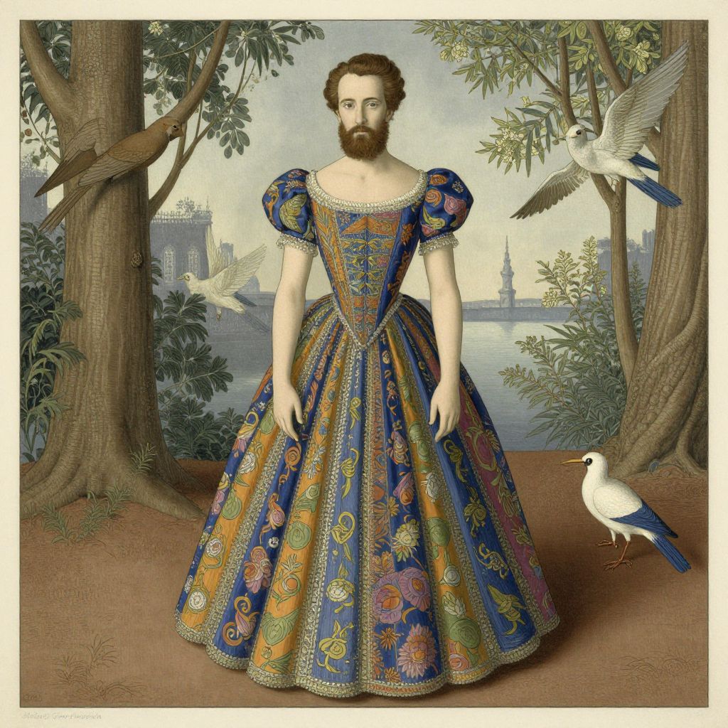 Birds-Eye View A bearded man in a colorful prom dress. Illustrated in the style of Bottero and Magritte. Formal portrait.,