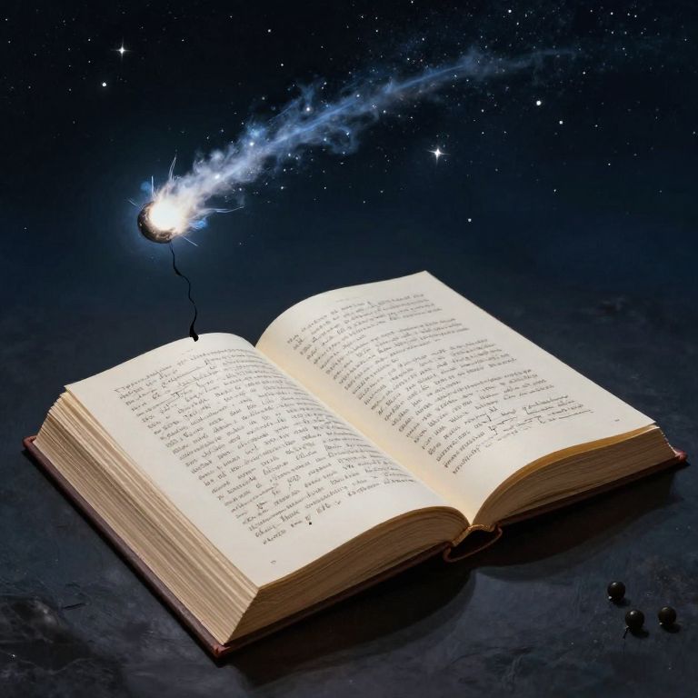 Open book with glowing text and a star-like comet on its top right corner, set against a starry night sky background. Digital artwork.