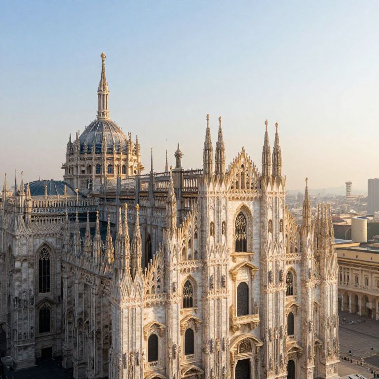 Photograph of an ornate, Gothic-style cathedral with intricate carvings and pointed spires, bathed in sunlight. The cathedral features a large central dome topped with a spire, surrounded by multiple smaller spires and arched windows. The building's facade is made of light-colored stone, with detailed statues and decorative elements. In the background, a hazy cityscape with modern buildings is visible under a clear, blue sky. The cathedral occupies the left side of the image, while the right side shows a smaller, simpler building. The overall color palette includes warm, golden tones from the sunlight and the light stone of the cathedral.