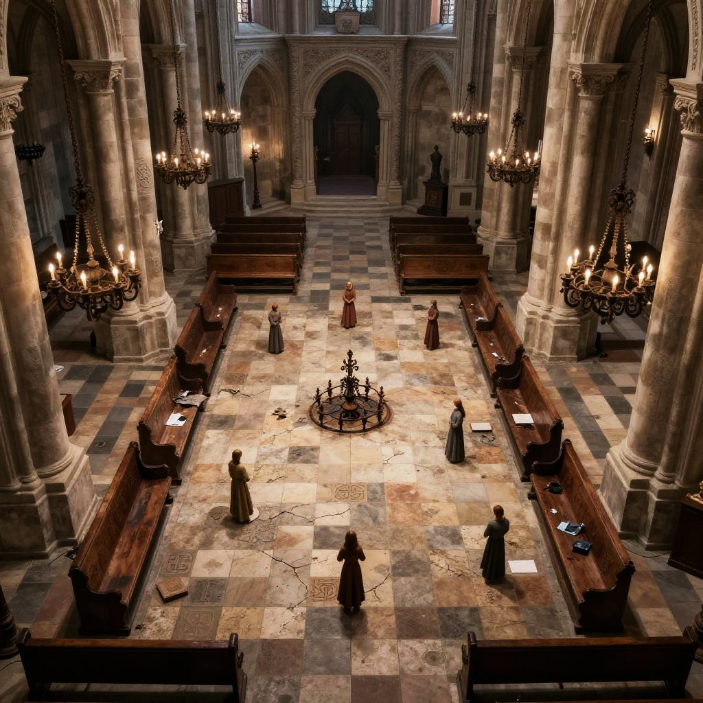 Dnd cathedral battlemap with expansive nave, cracked tile flooring, rusted iron chandeliers, broken pews, ornate religious symbols etched into stone walls, moody lighting for intense gameplay