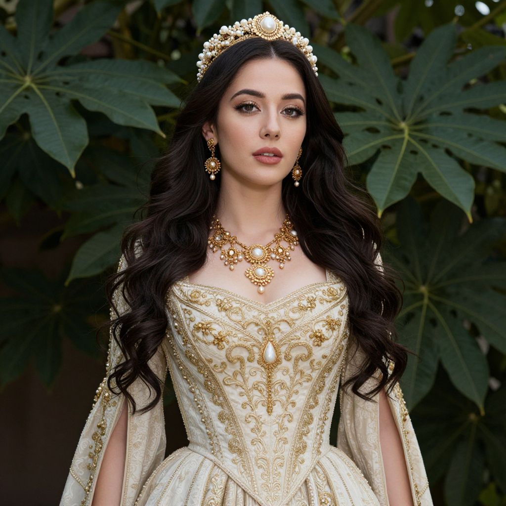 Elegant woman adorned with a pearl-embellished circlet and golden jewelry stands gracefully amidst lush green foliage, her flowing dark hair cascading over her shoulders as she wears a regal cream gown with intricate gold detailing.