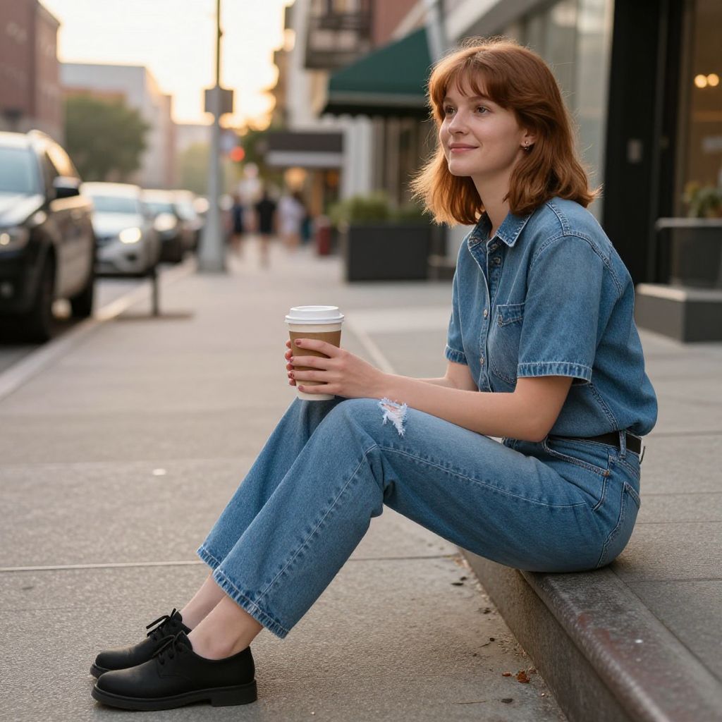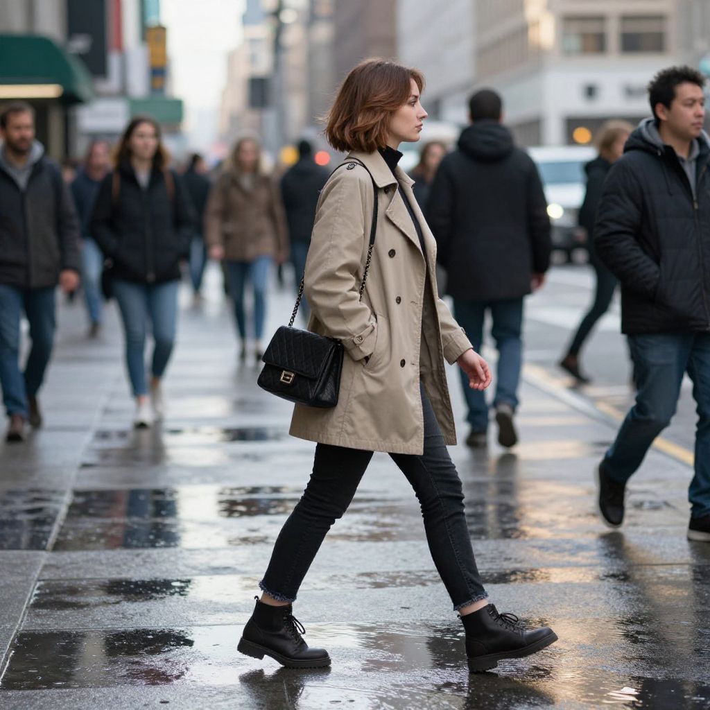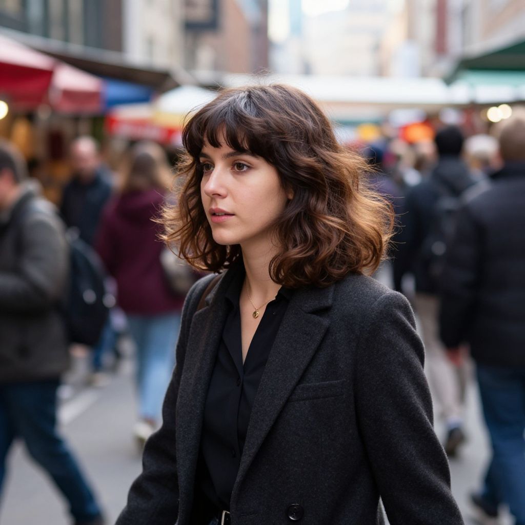 Woman with blunt cut with soft layers hairstyle walking through a bustling city street, city reflections in puddles, vibrant colors, realistic textures, dynamic pose, morning daylight, urban aesthetic.